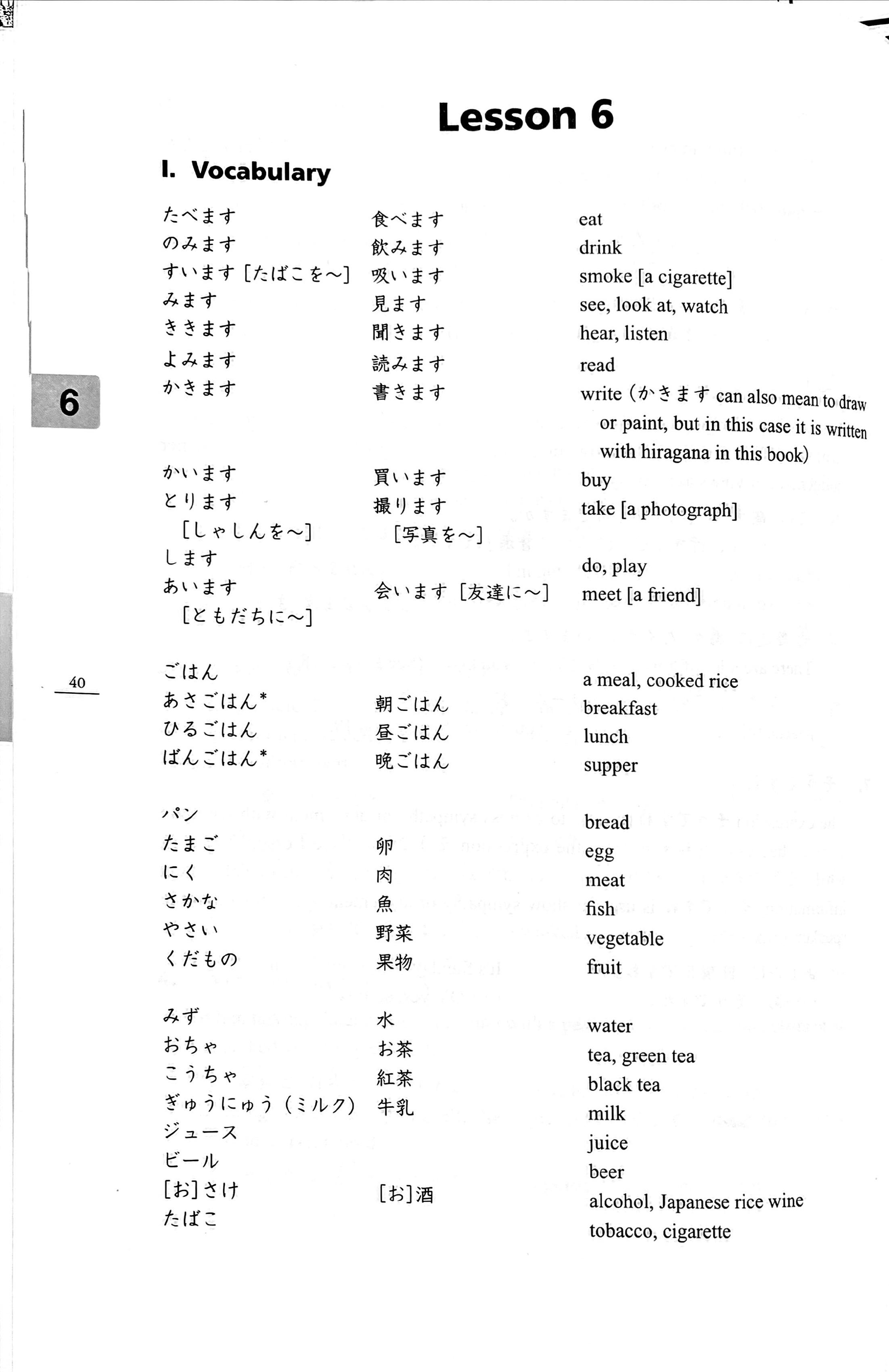The English study guide companion to the main textbook. Includes vocabulary lists, translations for sentence patterns, example sentences and conversations, reference vocabulary, and grammar explanations. Japanese words are shown in kanji and kana.